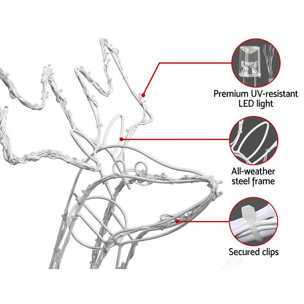 Bring the brilliance of Christmas to your home with our motorised Jingle Jollys 3PC LED Reindeer Light. The reindeer light comes in a family of three reindeers: a buck, a doe and a baby. The buck moves its head side to side, the doe moves its head up and down, while the baby remains still. Featuring a string of super bright LED lights, the UV-resistant rope light is set in a sturdy white metal frame shaped as a reindeer. The 10m long power cable gives you more flexibility on where you can set up the reindeer light. You can place it indoors in your living room, or outdoors on your front lawn for all your neighbours to appreciate. And you do not need to take the reindeer light down as soon as Christmas is over. It is waterproof and weather-resistant, so you can leave it out well into the new year. Create a lively and bright Christmas ambience throughout the season.